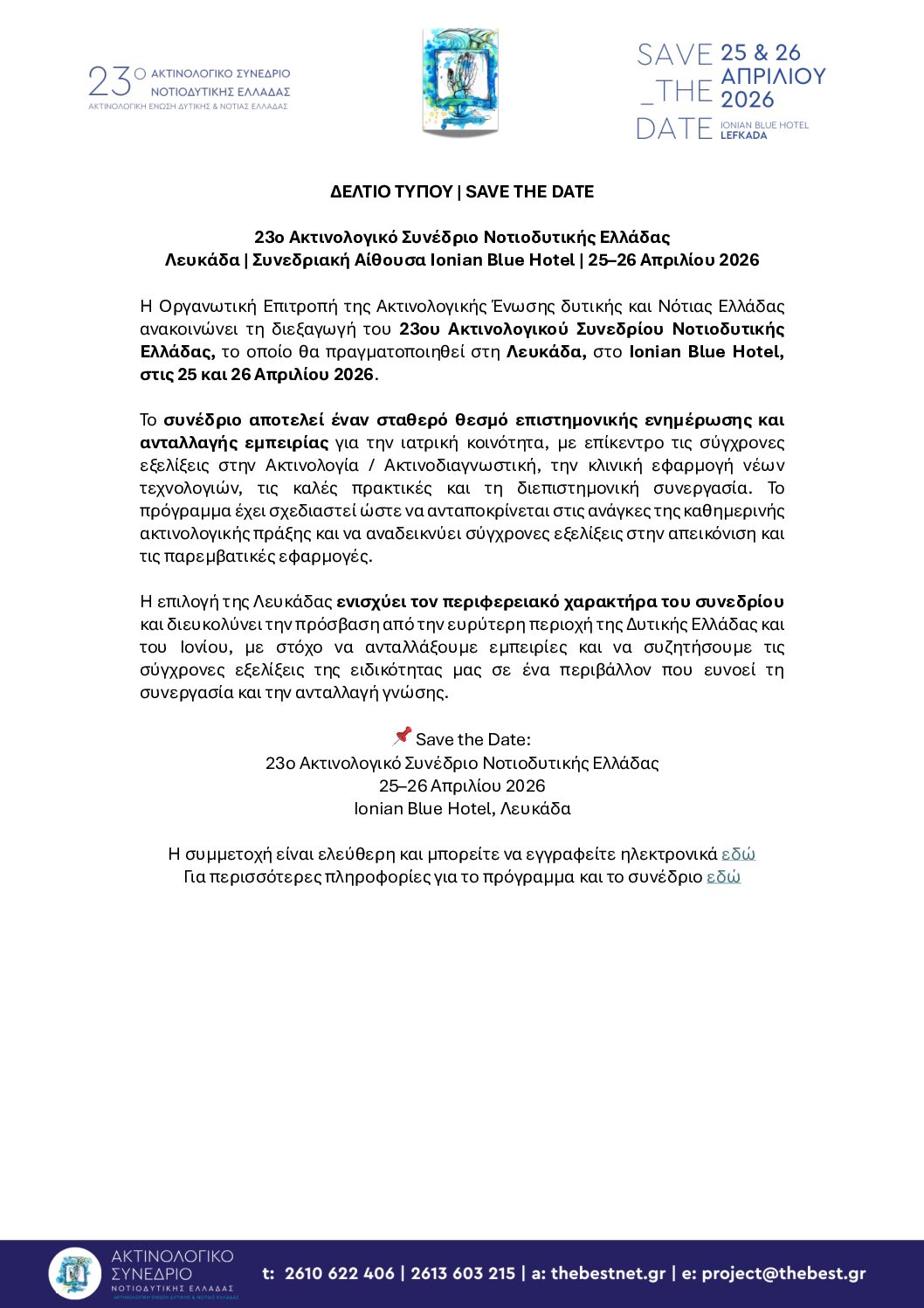 23ο ΑΚΤΙΝΟΛΟΓΙΚΟ ΣΥΝΕΔΡΙΟ ΝΟΤΙΟΔΥΤΙΚΗΣ ΕΛΛΑΔΑΣ, 25 & 26 ΑΠΡΙΛΙΟΥ, ΙΟΝΙΑΝ BLUE HOTEL LEFKADA Posted on 24 Απριλίου 202624 Απριλίου 2026 by Ιατρικός Σύλλογος Ηλείας